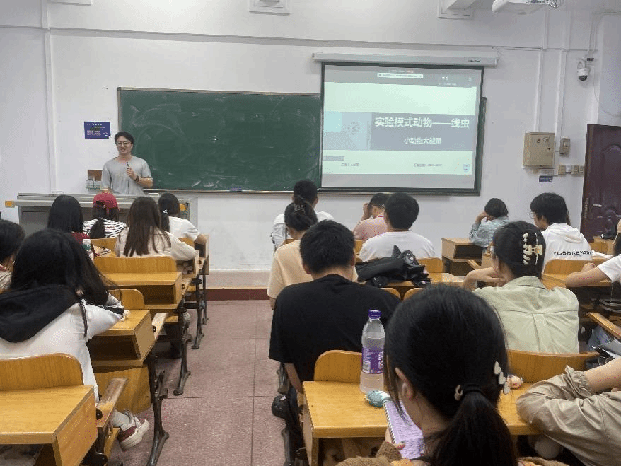 接着,赵蒙师兄就“实验模式生物基础——线虫,小动物大能量”为主题做了分享,他从线虫这一模式动物引入,介绍了2024年诺贝尔生理学或医学奖得主正是研究线虫而得奖的。科学家发现,线虫中微小核糖核酸在其转录后基因调控中的重要作用,激发起了在场同学们对科研的浓烈兴趣。