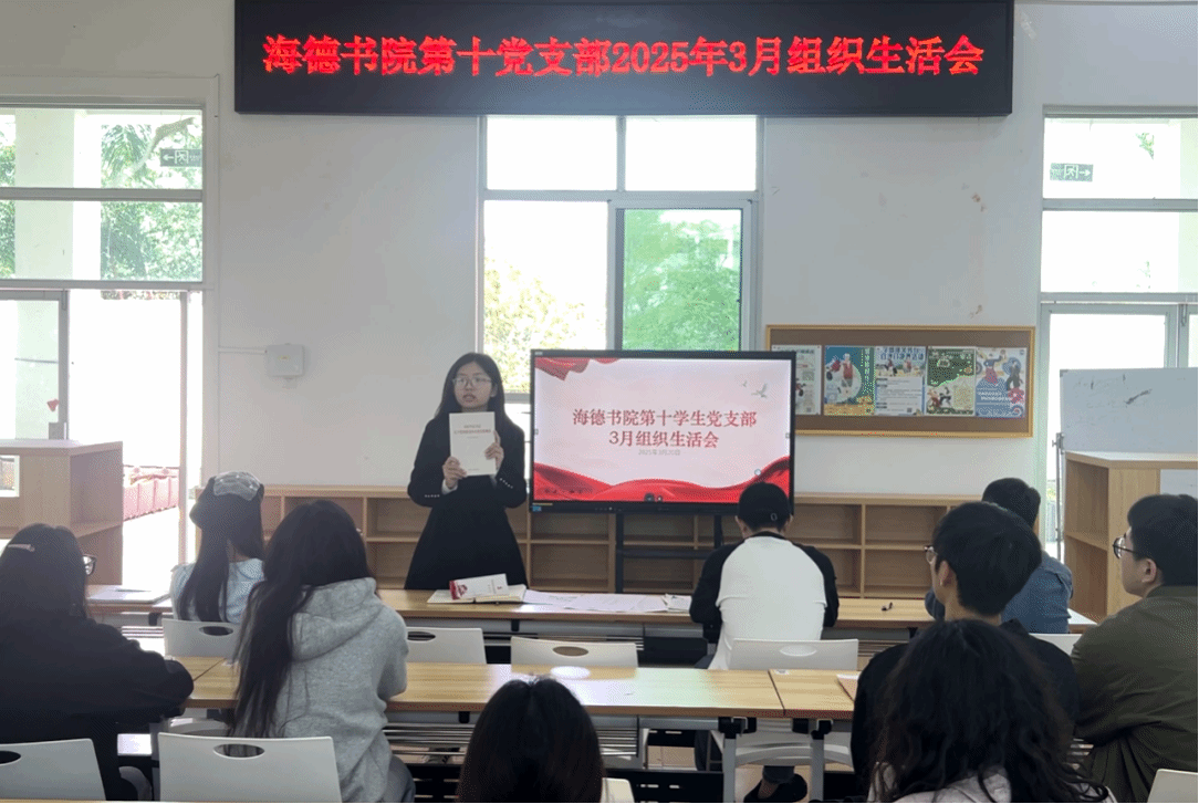 会议第二项,由积极分子分享学习心得。卿曦同志带领大家深入学习《习近平总书记关于党的建设的重要思想概论》、2025年全国两会精神。重点强调2025年全国两会精神中的十大任务,分享发展2025年新质生产力的发展原则与要素保障,向大家阐述高质量发展”新内涵,最后以国家和海南自贸港的高质量发展前景作美好祝愿。