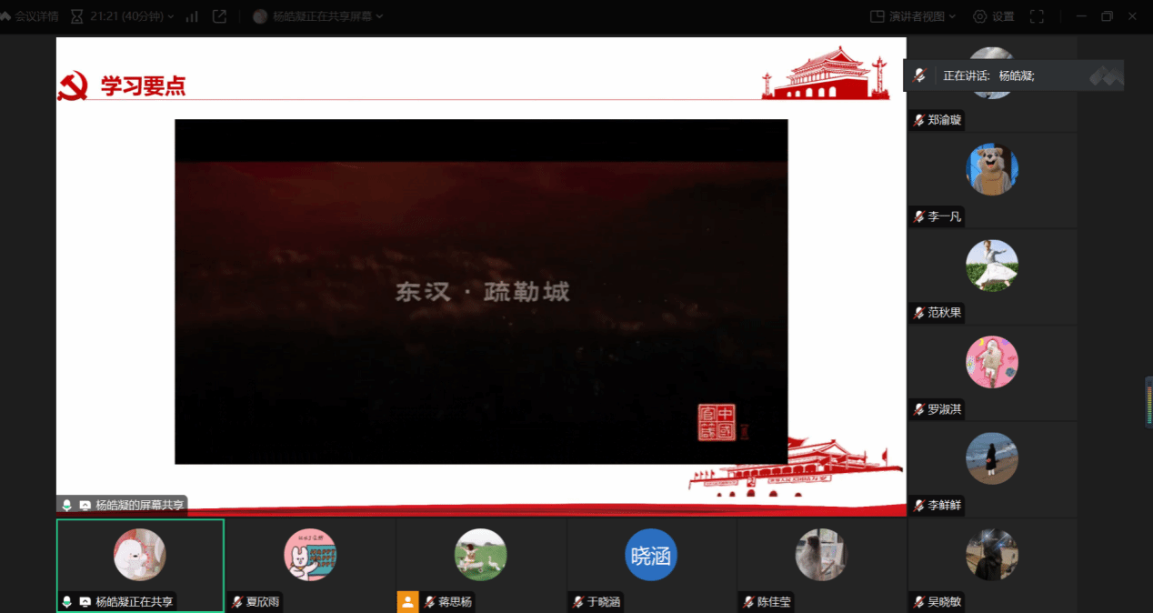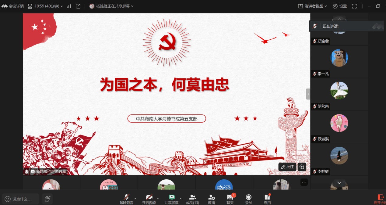 视频中,“十三壮士归玉门”的英雄史诗,生动诠释了《忠经》里“为国之本,何莫由忠”的精神。“杨皓凝同志强调,‘尽忠’不仅是对国家的忠诚,更是对人民、对职责的忠诚。”吴晓敏同志则表示中华民族不乏在危急时刻挺身而出的英雄,当代的党员同样要在学习工作中忠诚于党与人民,在关键时刻敢为人先。李鲜鲜同志认为为国尽忠不能光喊口号,还要付诸行动。夏欣雨同志认为,“忠君爱国”与“忠于人民”的精神内核穿越古今,是廉洁文化的重要体现,“忠孝廉节”的观念代代相传,在当代仍熠熠生辉。活动中,同志们围绕 “尽忠” 与廉洁文化,结合自身作为研究生党员的身份展开热烈讨论,提出应通过学术报国、诚信治学践行初心,同时积极关注社会问题,展现党员担当。