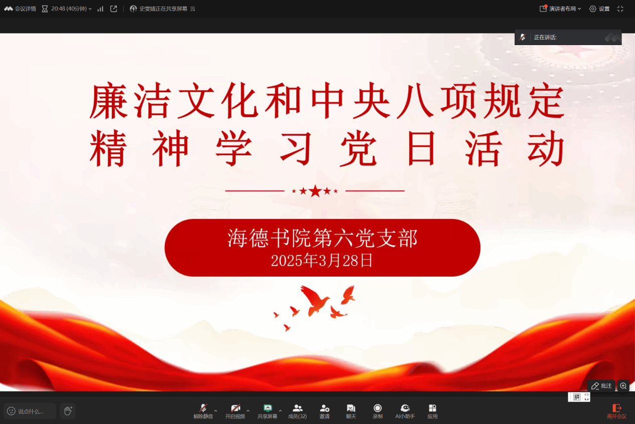 3月28日晚,yl88858永利集团第六党支部线上举行了线上“廉洁文化和中央八项规定精神学习”主题党日活动,并召开关于深入贯彻中央八项规定精神学习教育动员会。本次会议由支部全体党员、积极分子参加。