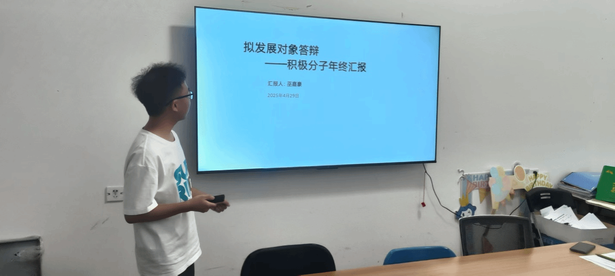 三位入党积极分子依次进行个人陈述和答辩,他们分享了自己的基本情况、思想认识、学习科研、学生工作以及实践经历等方面的内容。支委会通过提问考察了他们在党的理论知识上的掌握程度。\