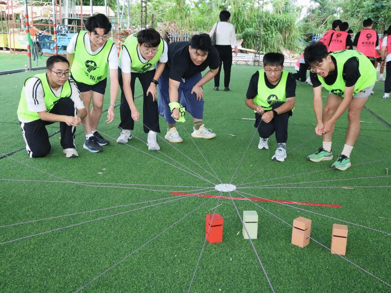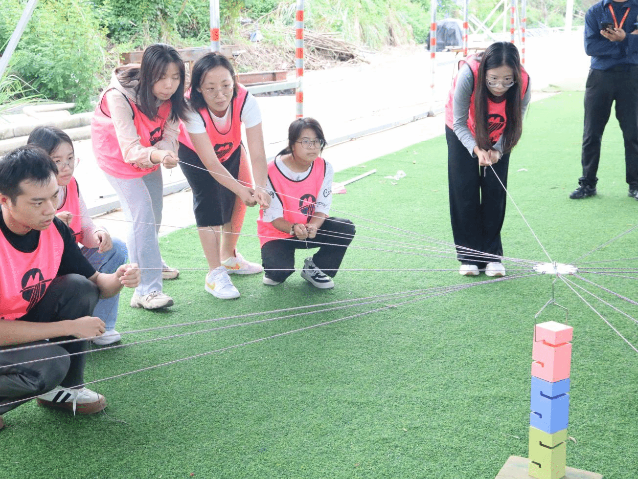 之后的步步高升项目更是对团队协作能力提出了更高要求,成员们手拉绳子,眼神中满是专注,齐心协力地将地下的七块木头叠加起来。过程中,大家屏气凝神、小心翼翼地维持木块的平衡,屹立不倒的木头也像他们坚定不移的团队信念,熠熠生辉。