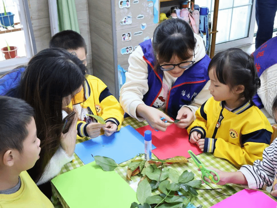 手工制作过程中,志愿者们手把手地提供指导和支持。活动中,遇到难题时,志愿者们总是耐心陪伴孩子们解决。寻找叶子作为素材、挑选合适的素材、清理多余的胶水,每一处都有他们的身影。