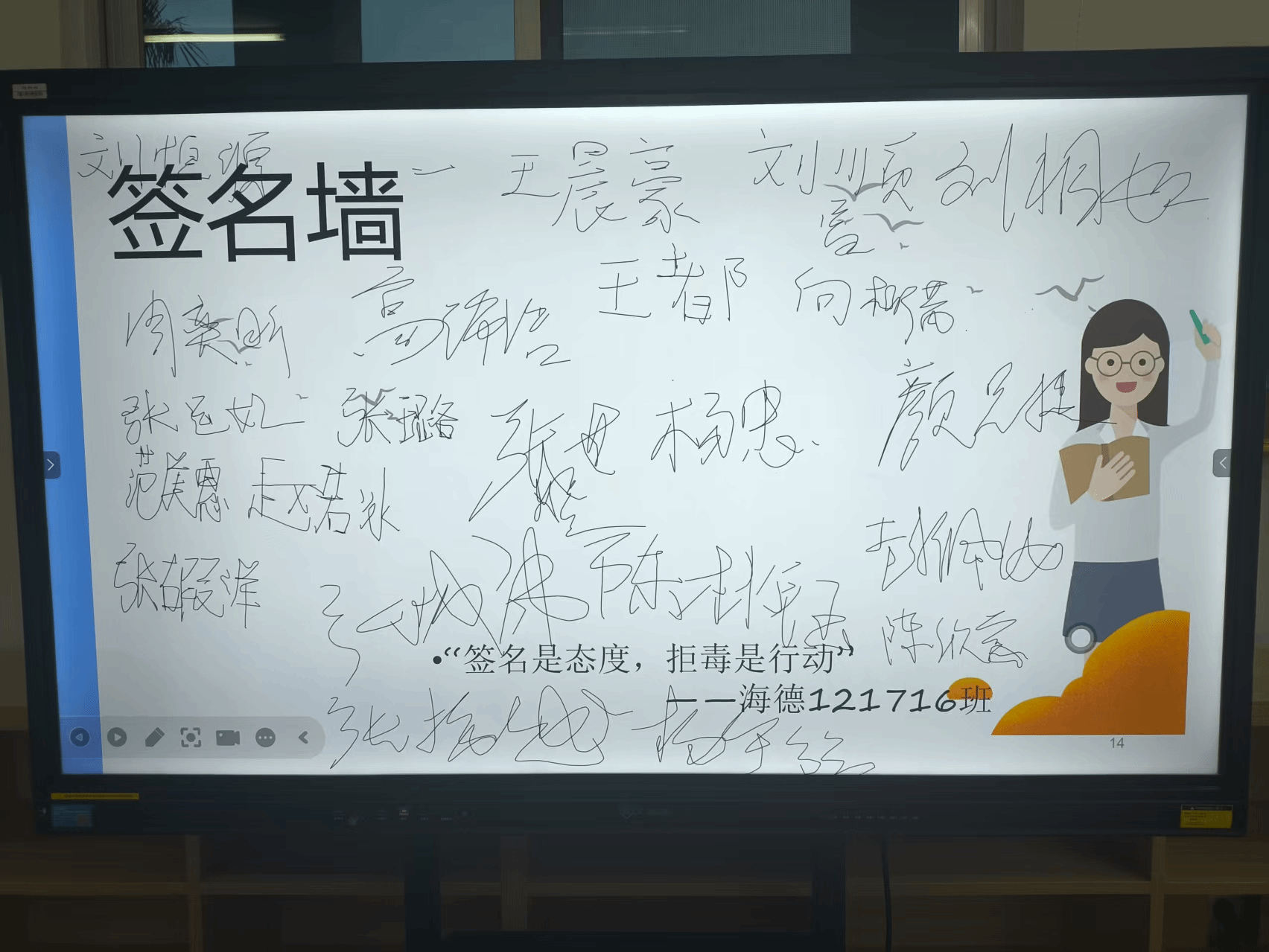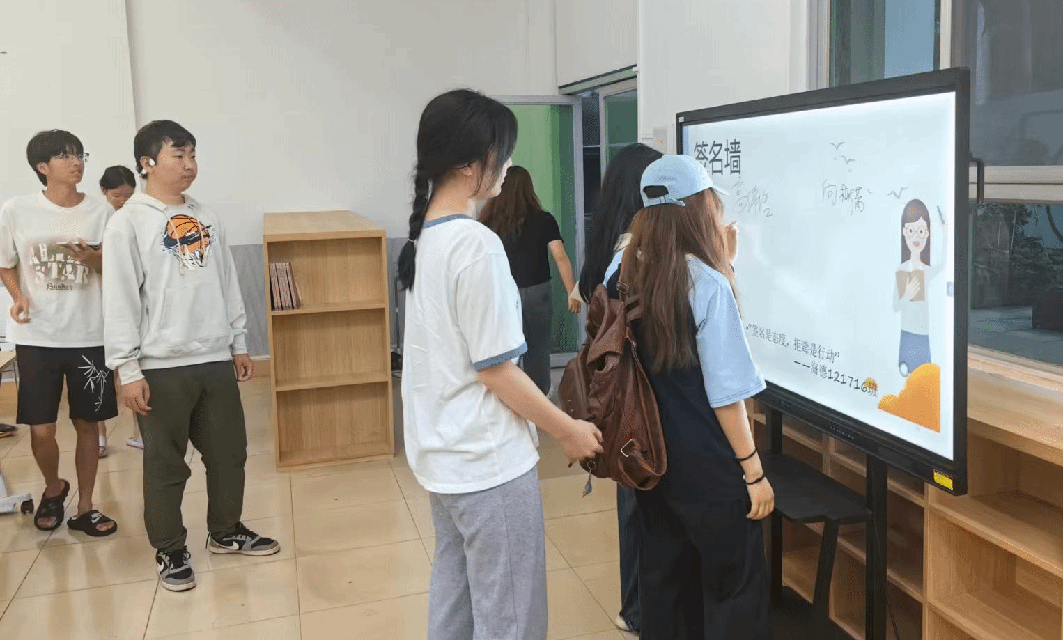 班会最后进行集体签名承诺仪式,同学们在签名墙上郑重留下名字,表达对抵制药物滥用和非法金融活动的坚定决心。