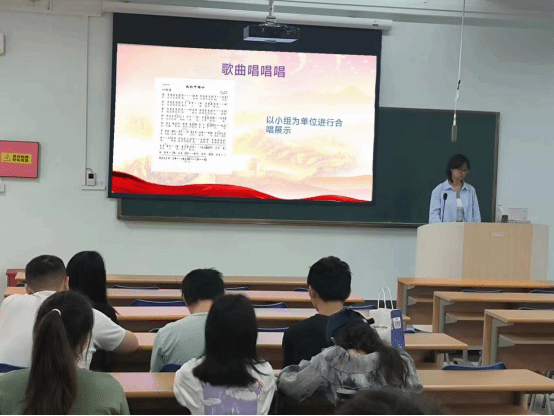 视频结束后,同学们以小组为单位,合唱歌曲《我的中国心》。伴随着动听的音乐,同学们心怀对祖国的忠诚和热爱,和着旋律唱响歌曲,歌声嘹亮动听,情感充沛。