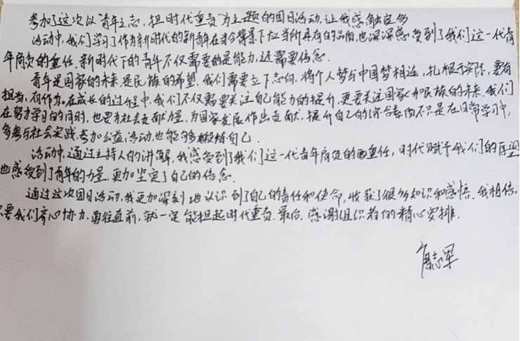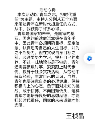 第二项,学习《以青年的身份担当时代重责》。通过学习,同学们纷纷表示要从现在做起努力学习,提升素质、积极投身社会实践、勇于担当,敢于创新,为国家的未来发展贡献自己的力量。