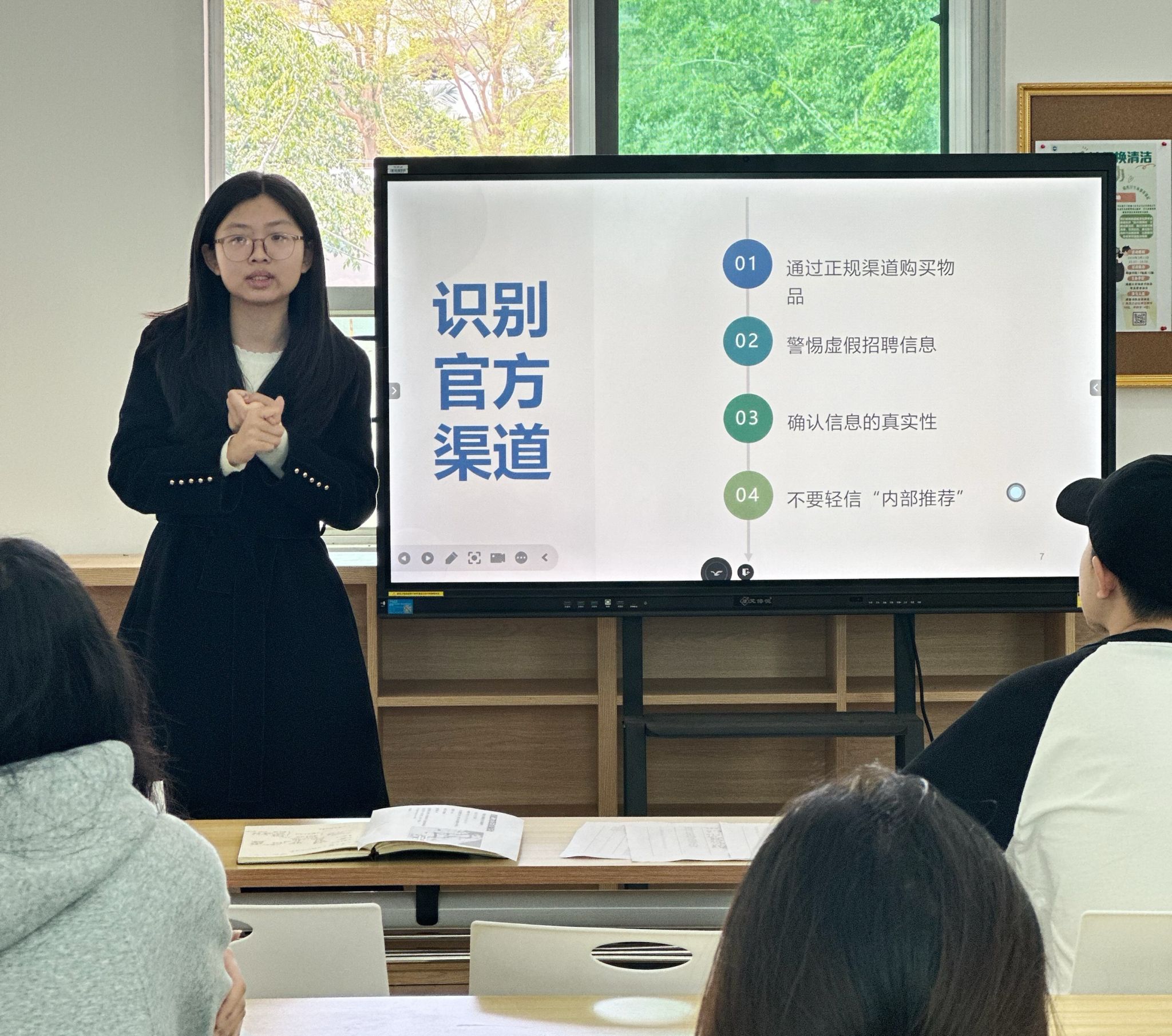 会议首先围绕防诈骗展开详细讲解。张晓涵老师结合近期高校真实案例,剖析了网络钓鱼、冒充熟人、虚假投资理财等常见诈骗手段,提醒各位同学不轻信陌生信息,对可疑短信、链接保持警惕,务必通过官方渠道核实信息。拒绝私下交易,网购、购票需选择正规平台,避免脱离平台支付或添加私人联系方式,要时刻警惕各类诈骗陷阱,守护财产安全。