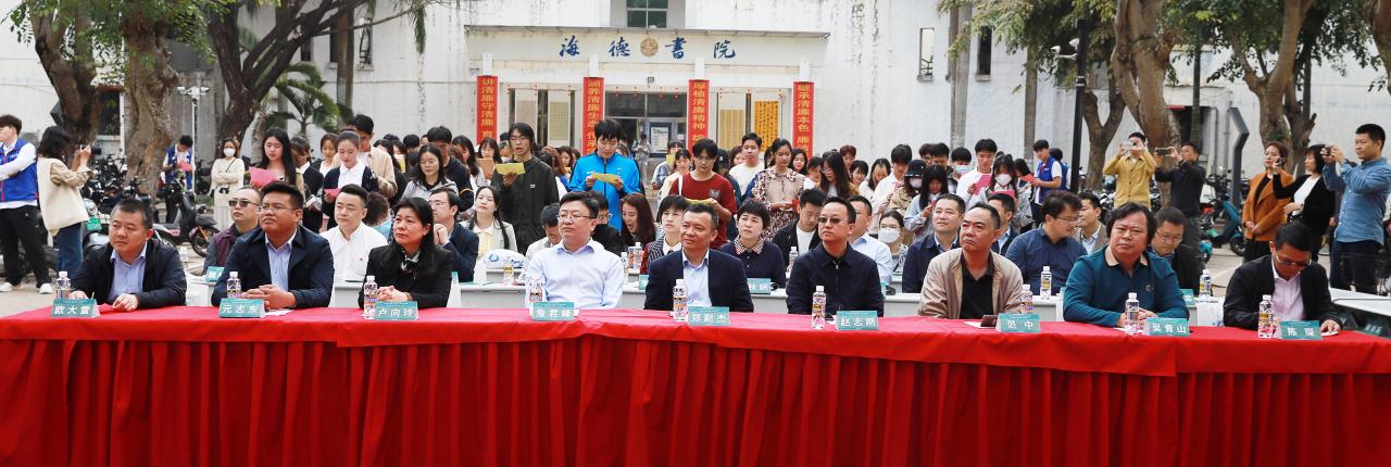 海南省纪委监委宣传部部长赵志刚、副部长詹君峰;海南省书法家协会副主席、海口市书法家协会主席范中;海南省美术家协会副主席卢向玲;海南大学党委常委、纪委书记、监察专员郑尉杰;海南省书法家协会副秘书长吴青山;海南省青年美术家协会副主席元志东;海南大学法学学院(纪检监察学院)蒙秋妍书记;海南大学纪委副书记陈琛;海南大学纪委副书记欧大雷;海南大学纪检监察一处副处长李燕庄;海南大学纪检监察二处副处长崔万春;海南大学学生工作部(学生工作处、人民武装部)副部长欧建猛;海南大学学生工作部(学生工作处、人民武装部)副部长李昌郁;海南大学团委副书记郑鹏;天宫书院党委书记易振;乘风书院党委书记黄小欧书记、子衿书院党委书记李海朋书记;青云书院党委书记罗国忠书记;南海书院党委书记王林桂书记;yl88858永利集团党委书记韩胜丁及师生代表200余人参加本次活动。
