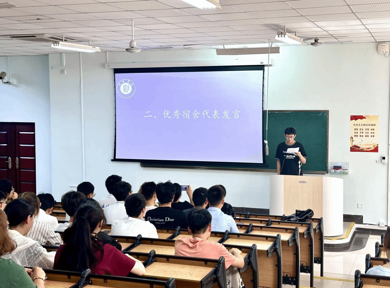 会议开始,辅导员张晓涵发表讲话,她总结了新生入校以来出现的一些宿舍问题,并指出宿舍检查每月都会开展,获奖的同学要保持养成的良好的卫生习惯。接着,优秀宿舍获奖代表上台发表感言,杨永晔同学表达了对书院举办此次活动的感谢,并分享了自己与舍友相处的小妙招和对接下来继续保持整洁的宿舍环境的决心。
