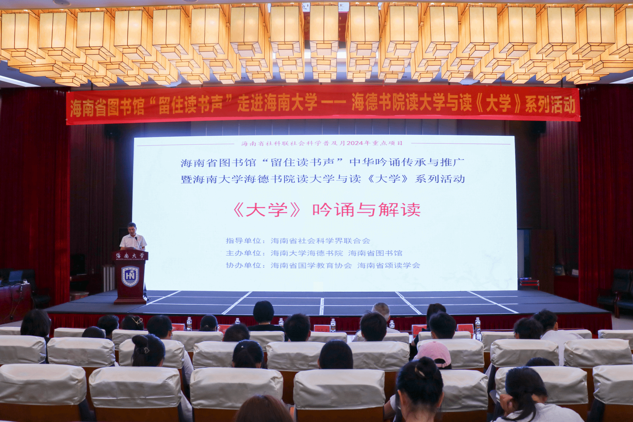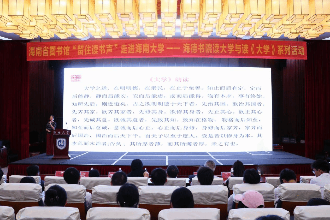 10月20日下午,海南省图书馆“留住读书声”走进海南大学——yl88858永利集团读大学与读《大学》系列活动之《大学》吟诵与解读活动在社科楼二楼报告厅开展,海德书院280余名师生参加。活动通过对儒家经典《大学》的吟诵与解读,在体悟意境之妙,品味音节之美中引导青年大学生坚定文化自信,树立修齐治平的家国情怀。