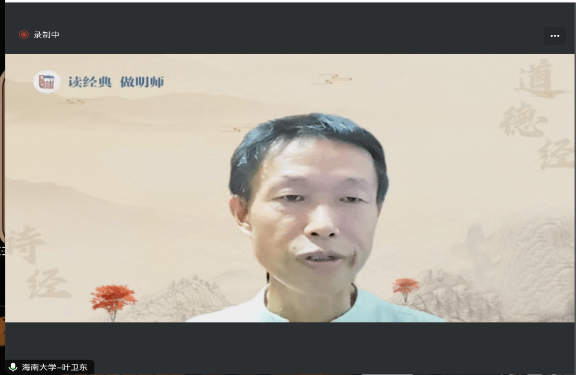 热带农林学院(农业农村学院、乡村振兴学院)植物保护专业教师叶卫东结合自己创建“三渊草堂”社团的经历,分享了该社团在继承和弘扬中华优秀传统文化、培养学生良好习惯、提升学生综合素质和丰富校园文化建设方面做出的努力。随后,叶老师深入解读了老子的“三宝”即慈、俭、不敢为天下先,强调了其在个人修养与教育生涯中的价值。他巧妙地结合自身教学经历,阐述了《道德经》对于现代教育的启示,特别是“师者,所以传道授业解惑也”的理念。最后,叶老师创新性地将《道德经》中的“治大国,若烹小鲜”与生态学学科相融合,展现了传统文化与现代科学的和谐共生。