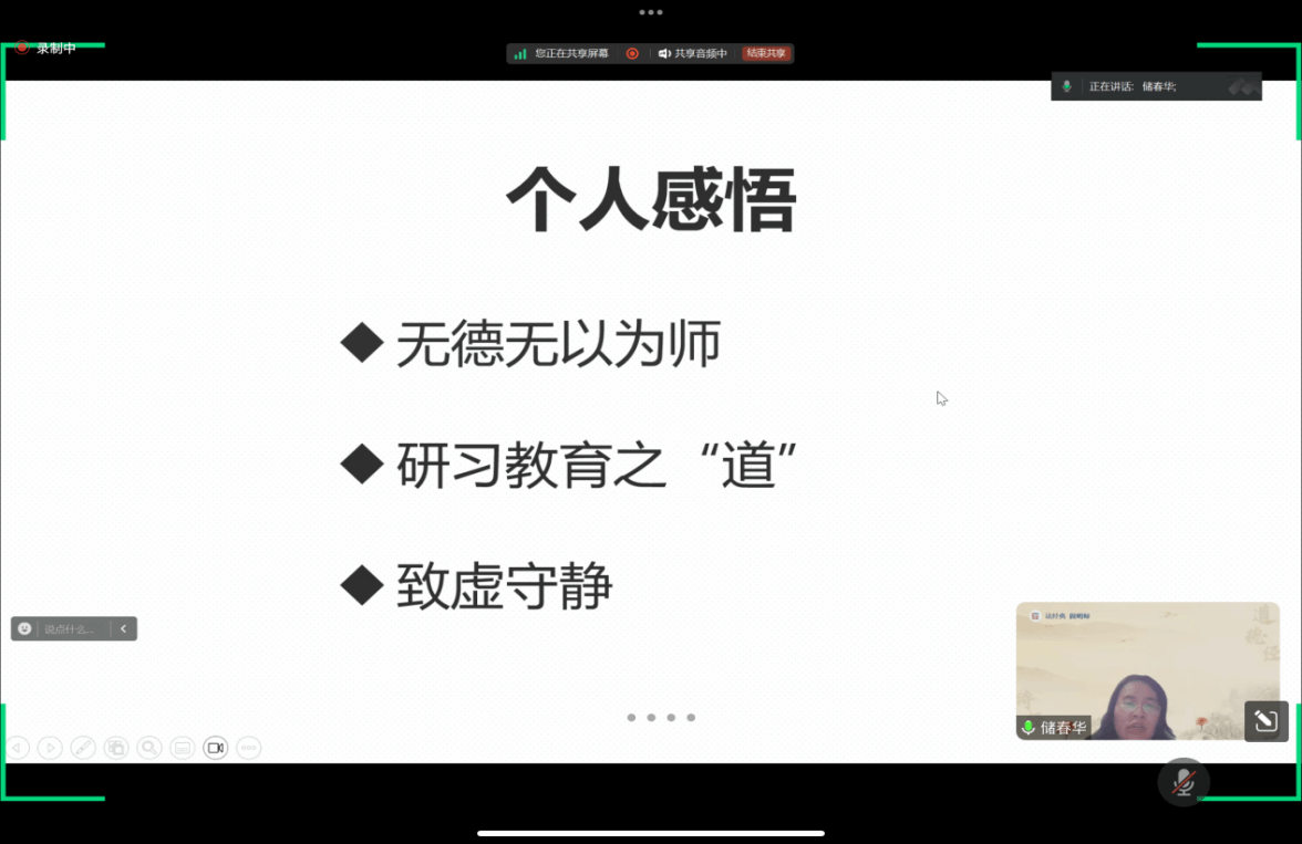机电工程学院电气工程专业教师储春华以简洁明快的语言介绍了老子的生平及其作品简介,并将“德”、“道”、“致虚守静”三方面与教学生活相关联,提出了许多富有启发性的见解。她认为,作为教师,应当遵循“道”的原则,以自然、和谐的方式引导学生成长;同时,要注重培养学生的“德”,使他们在学习知识的同时,也能学会做人、做事的道理;而“致虚守静”则是一种重要的教学心态,它要求教师保持内心的平静与谦逊,以更加开放和包容的心态去面对学生和教学工作中的挑战。