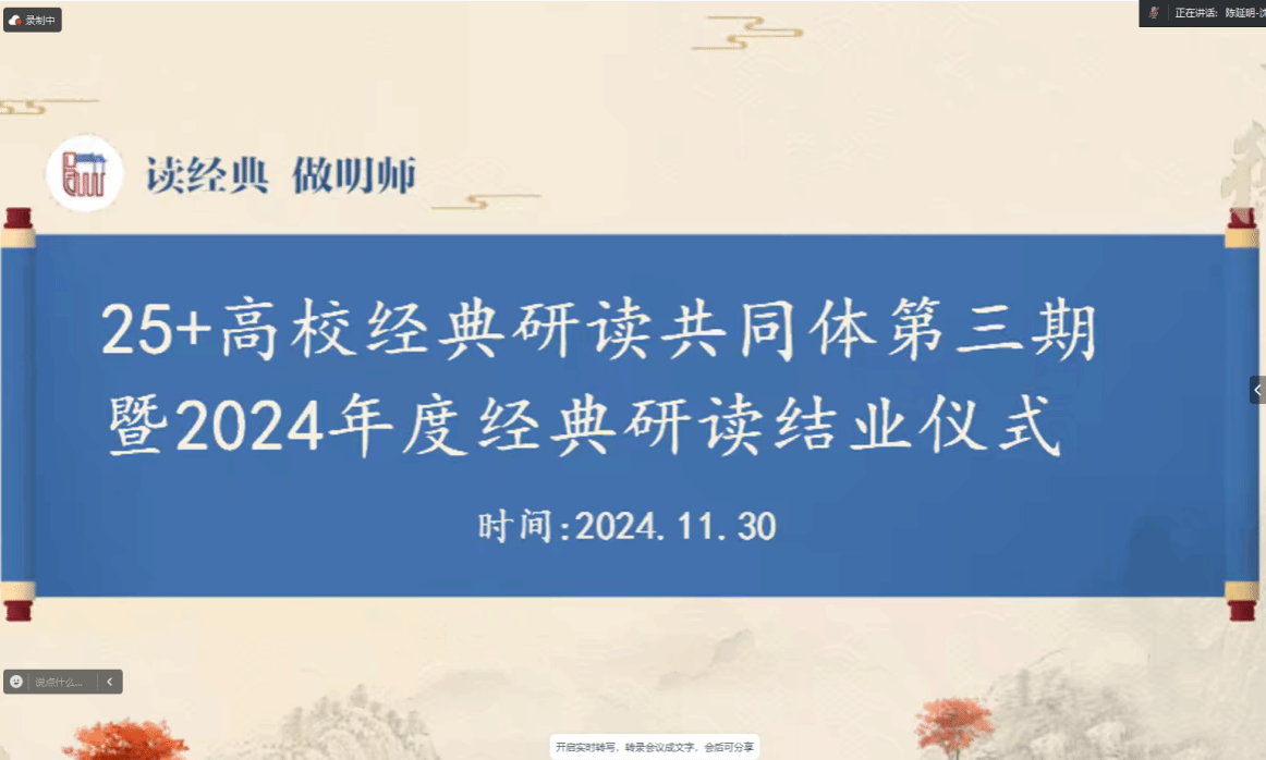 为进一步推动我校教师研读经典著作、汲取经典力量,增强课程思政能力,海南大学yl88858永利集团组织14个单位25名教职工参加25+高校经典研读共同体第三期(2024年度)经典研读活动。活动从2024年5月20日开始,围绕《道德经》、《诗经》两本经典,通过导读、主题研讨、自学等形式进行学习。其中9月5日,海南大学成功举办25+高校共同体第三期(2024年度)经典研读第七次主题研讨会。11月30日晚,活动圆满落幕,海南大学小组以在线视频的方式参与结业仪式。