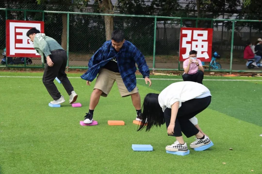 大家需要使用三块砖头过“河”,期间手脚不能碰地,只能通过向前放置砖头的方式来一步步移动。看着一些手脚不协调的同学的滑稽的动作,大家都忍不住哈哈大笑。