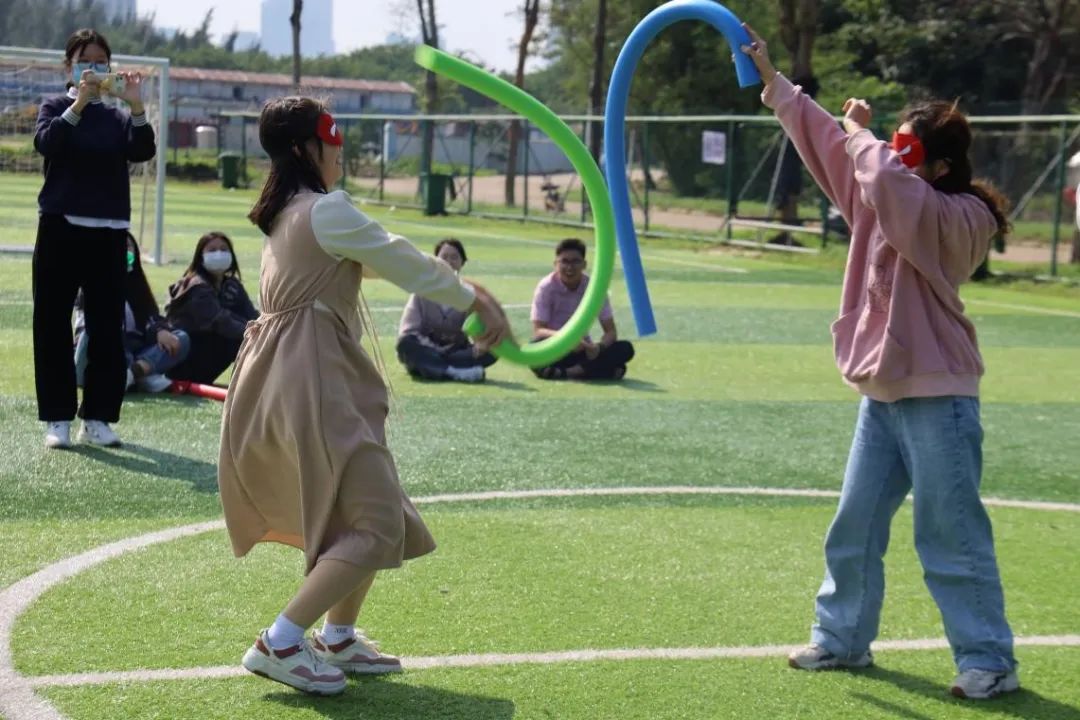 每组派出一人蒙眼上阵,被其他玩家用泡沫条打到头部就算淘汰。同学们个个摩拳擦掌,有的直捣黄龙,径直朝其中一队走去,一举将其淘汰;有的暗自观察,听到哪个方位开启战斗,就悄悄潜伏过去偷袭一波;还有的采取守株待兔的战略,自己不动,待人过来,便对着脚步声的方向直接一击。