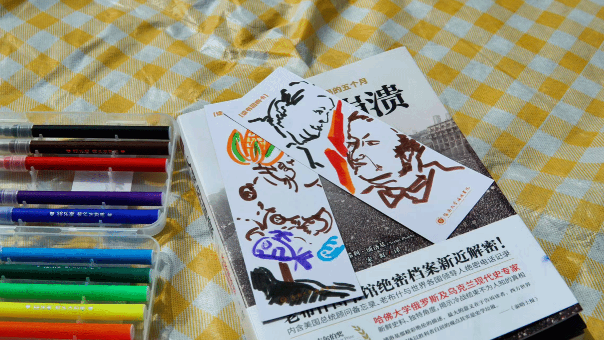 在“绘书凝意”环节,空白书签化身“思想画布”。哲学系同学以线条勾勒《大国的崩溃》的人物像,美术生将《六芹山革命根据地人物志》描绘成绚烂星空,更有同学以“反差萌”风格将《如果名画都是猫》改成漫画。参与者通过艺术创作,让文字与想象力碰撞出独特火花。